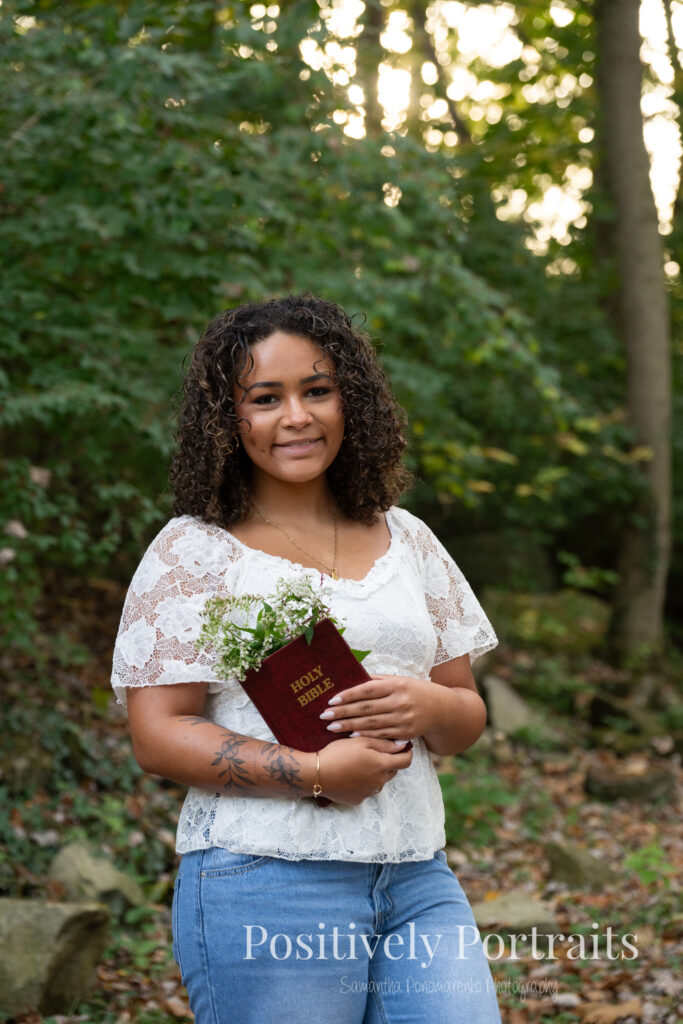 We began Jadyn’s senior session tucked into the woods at David Fortier River Park. She wore a white top paired with jeans, a classic look that photographed beautifully against the greenery and soft light filtering through the trees. The natural setting of David Fortier River Park created such a peaceful and earthy backdrop, which felt especially fitting as Jadyn brought her Bible with her for this portion of the session. This detail added so much meaning and authenticity to her senior photos. The quiet trails and natural textures of the park made this part of her session feel calm, reflective, and personal, which is something I always love capturing during senior pictures.