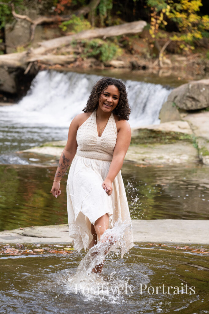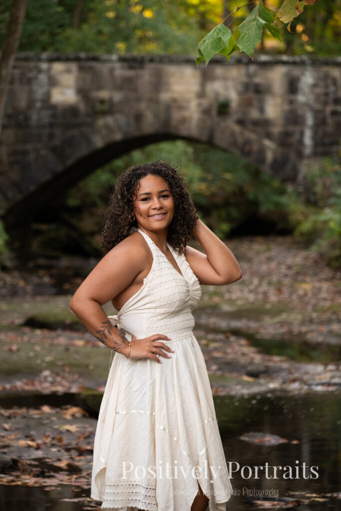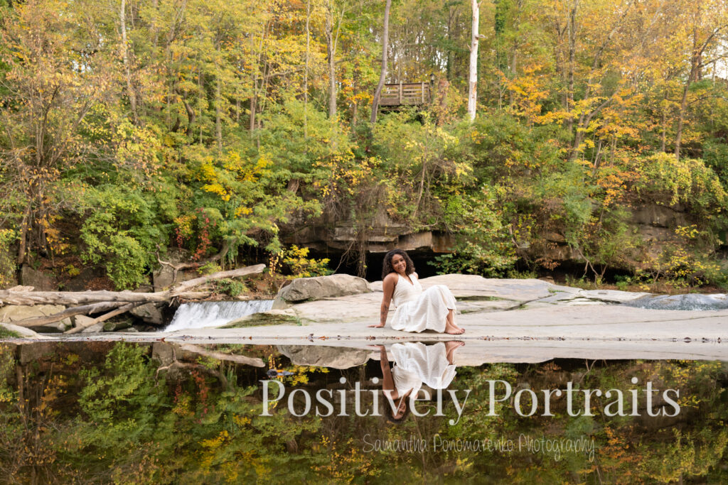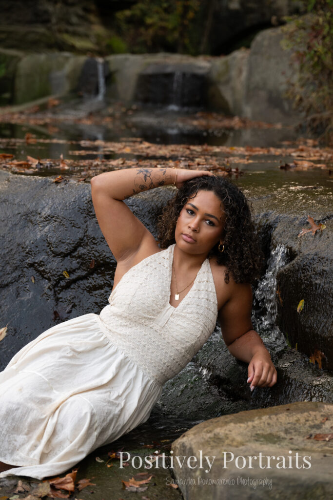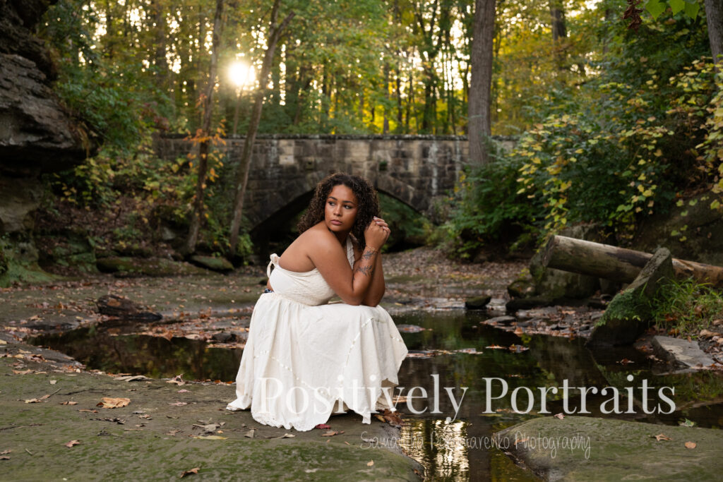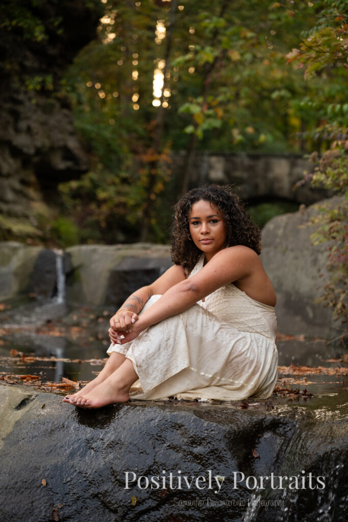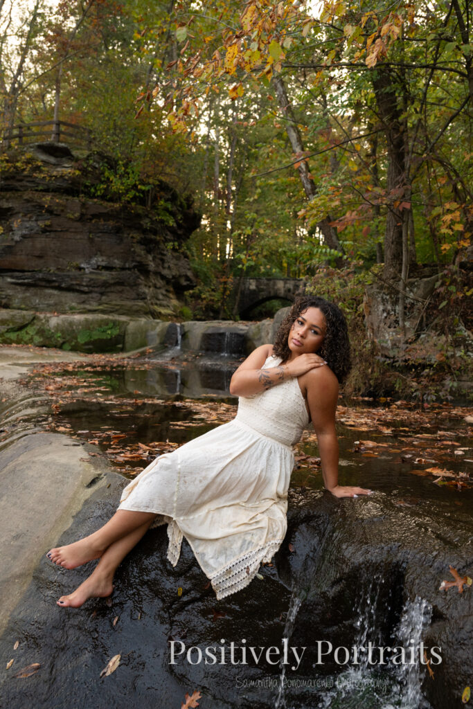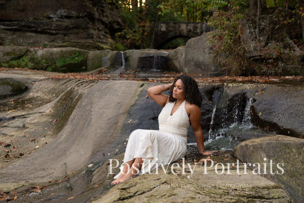 For her next outfit, Jadyn changed into a white dress to celebrate her senior year. We moved closer to the waterfall at David Fortier River Park, one of the most recognizable spots in Olmsted Falls for photos. The waterfall created a stunning backdrop, adding movement and drama while still keeping everything timeless. White dresses photograph so beautifully against the stone, water, and greenery, and Jadyn looked absolutely radiant. This portion of her senior photo session truly captured the excitement and significance of her senior year, standing confidently in such an iconic Northeast Ohio location.