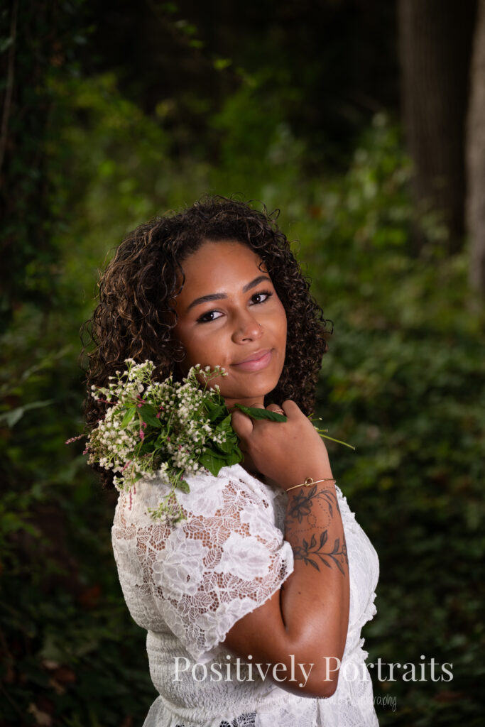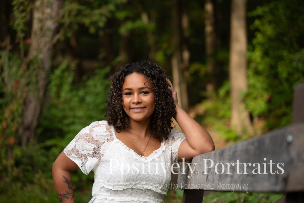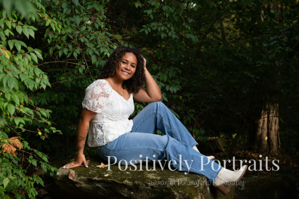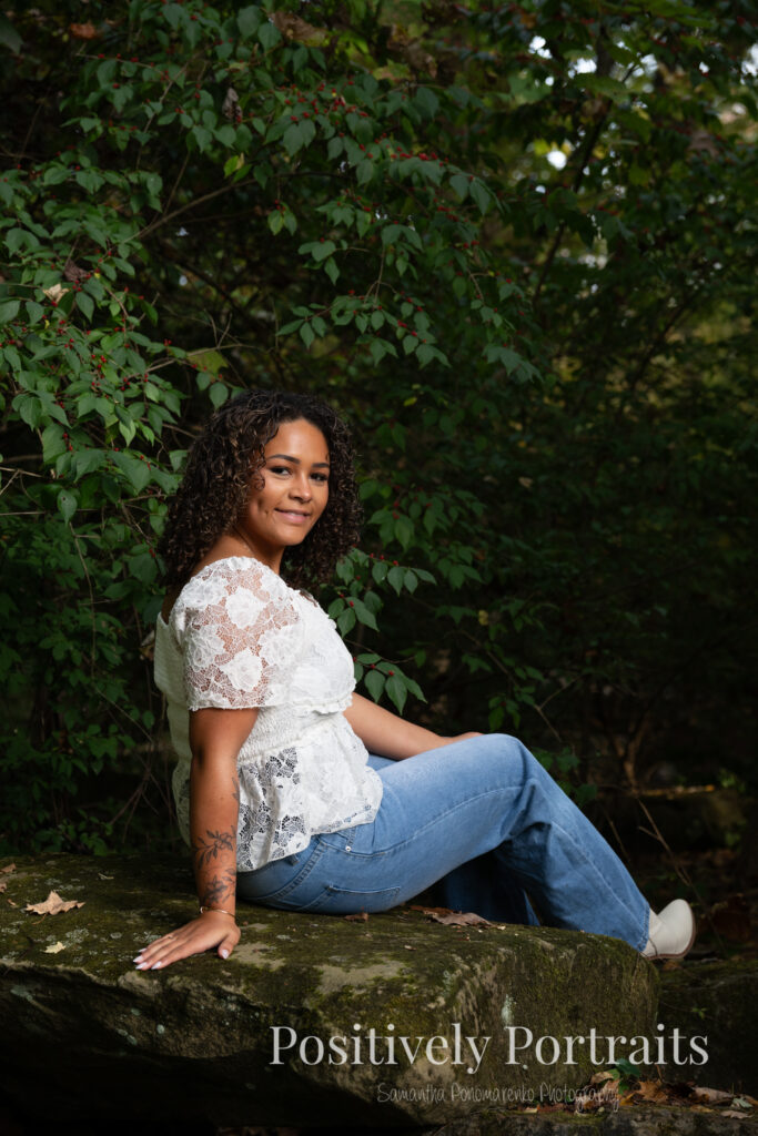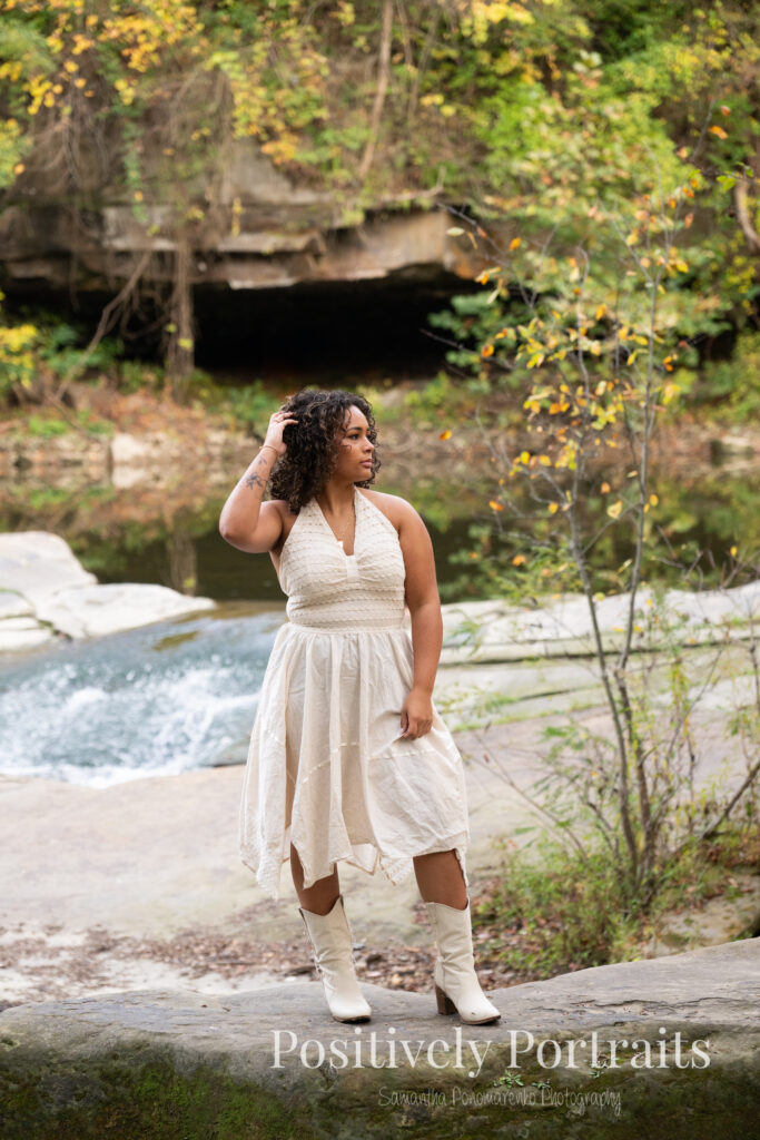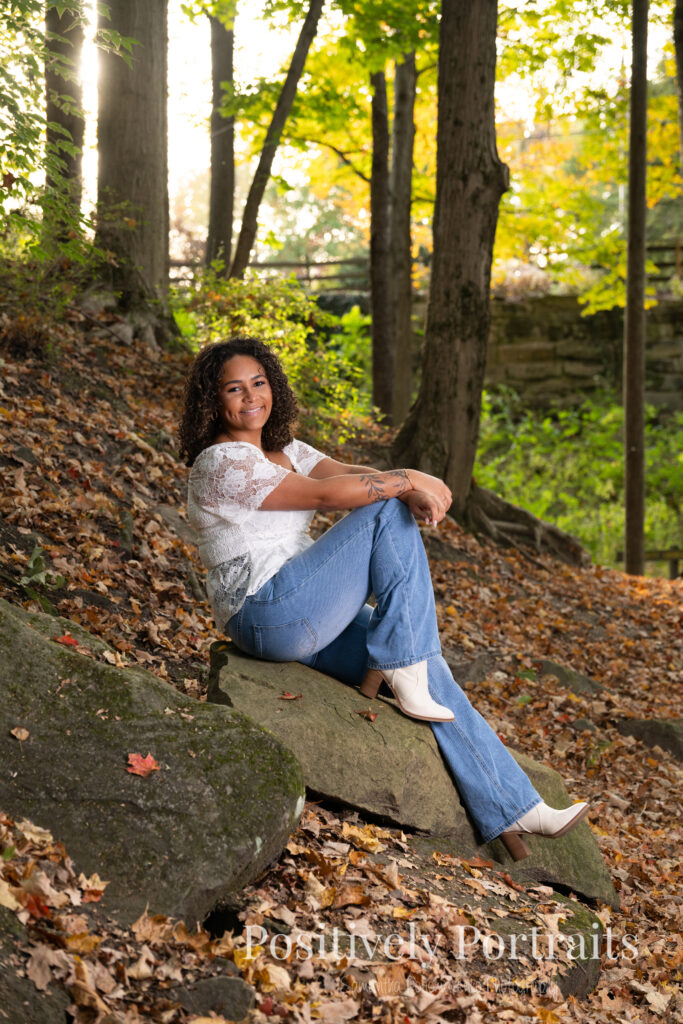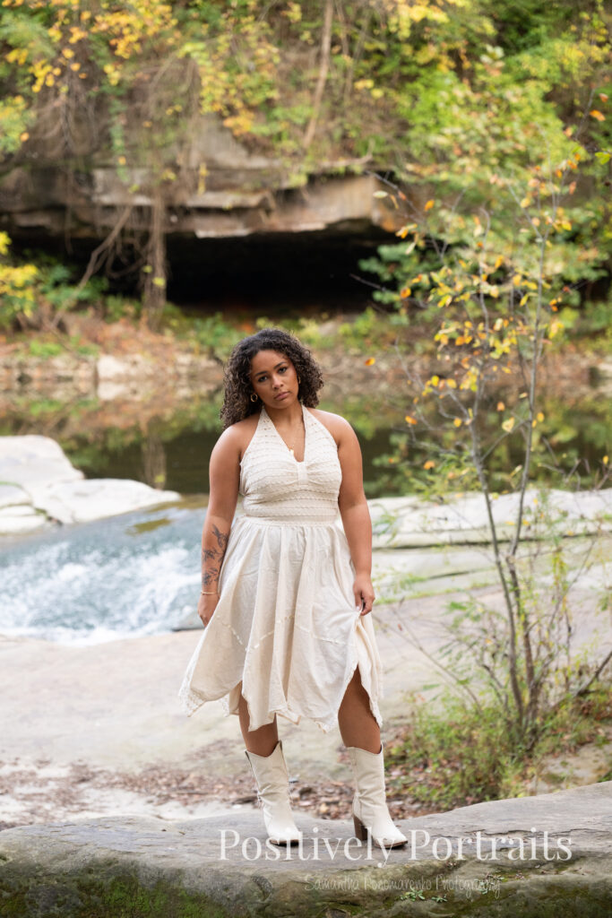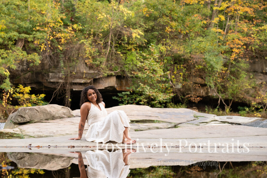 For her next outfit, Jadyn changed into a white dress to celebrate her senior year. We moved closer to the waterfall at David Fortier River Park, one of the most recognizable spots in Olmsted Falls for photos. The waterfall created a stunning backdrop, adding movement and drama while still keeping everything timeless. White dresses photograph so beautifully against the stone, water, and greenery, and Jadyn looked absolutely radiant. This portion of her senior photo session truly captured the excitement and significance of her senior year, standing confidently in such an iconic Northeast Ohio location.