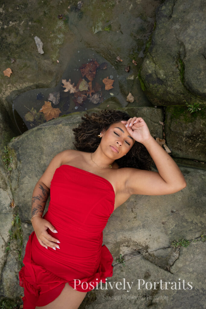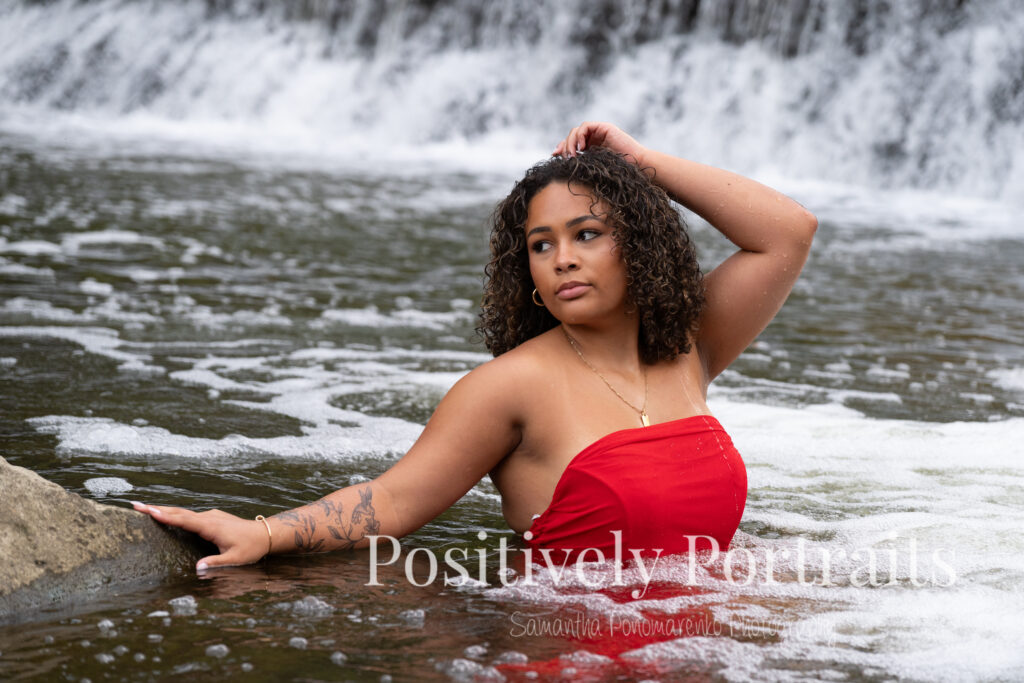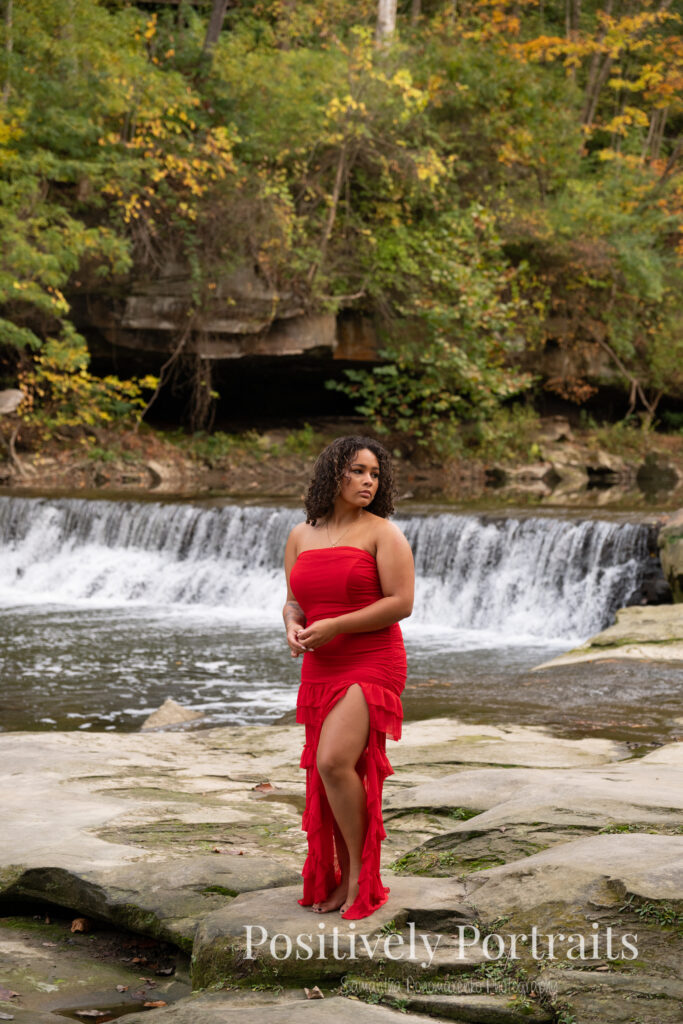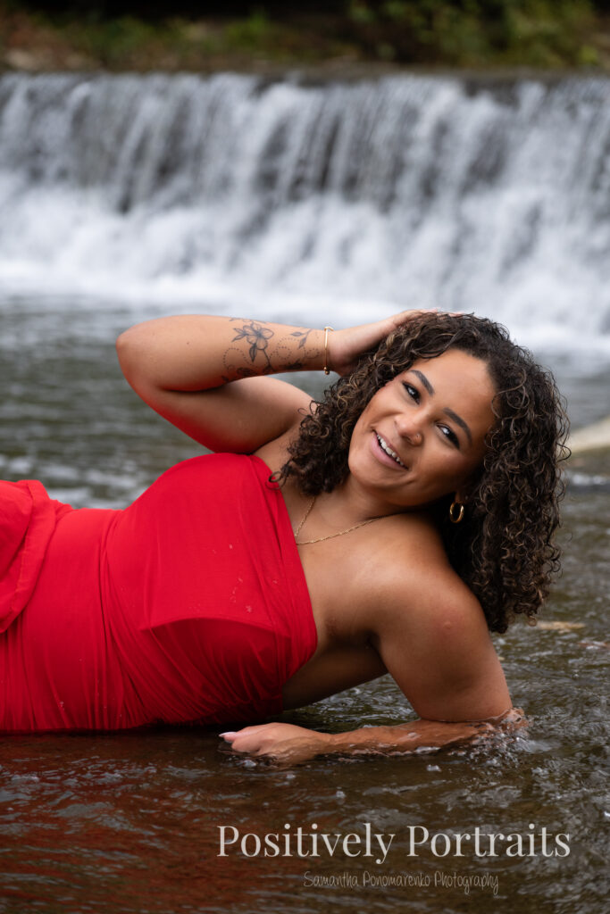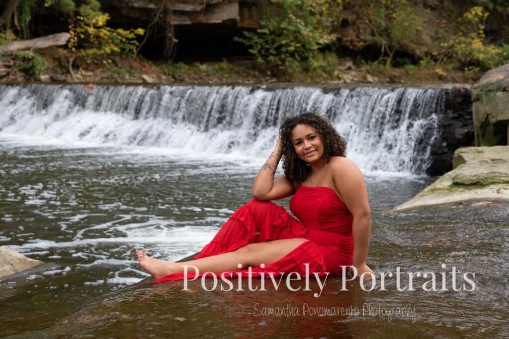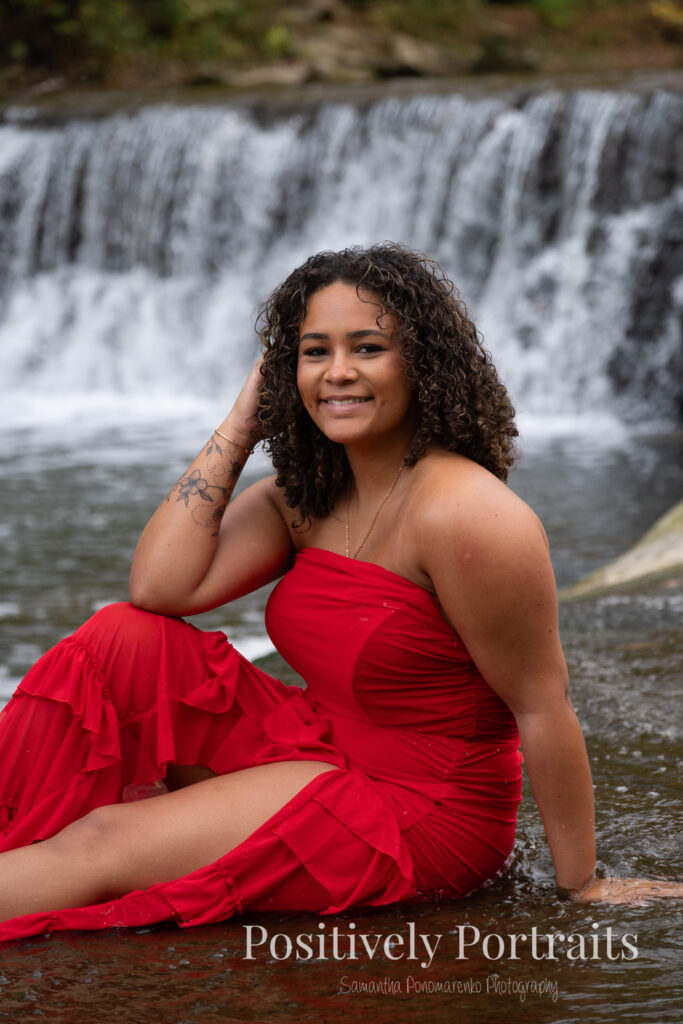 To finish the session, Jadyn changed into red and headed right down by the falls. She even stepped into the water, which says so much about her bold and adventurous personality. This part of the session was fun, fearless, and full of energy. The contrast of the red outfit against the water and rocks made for such powerful senior portraits. Not every senior is willing to get in the water, but Jadyn embraced the moment completely, and it resulted in some of the most memorable images from her session.