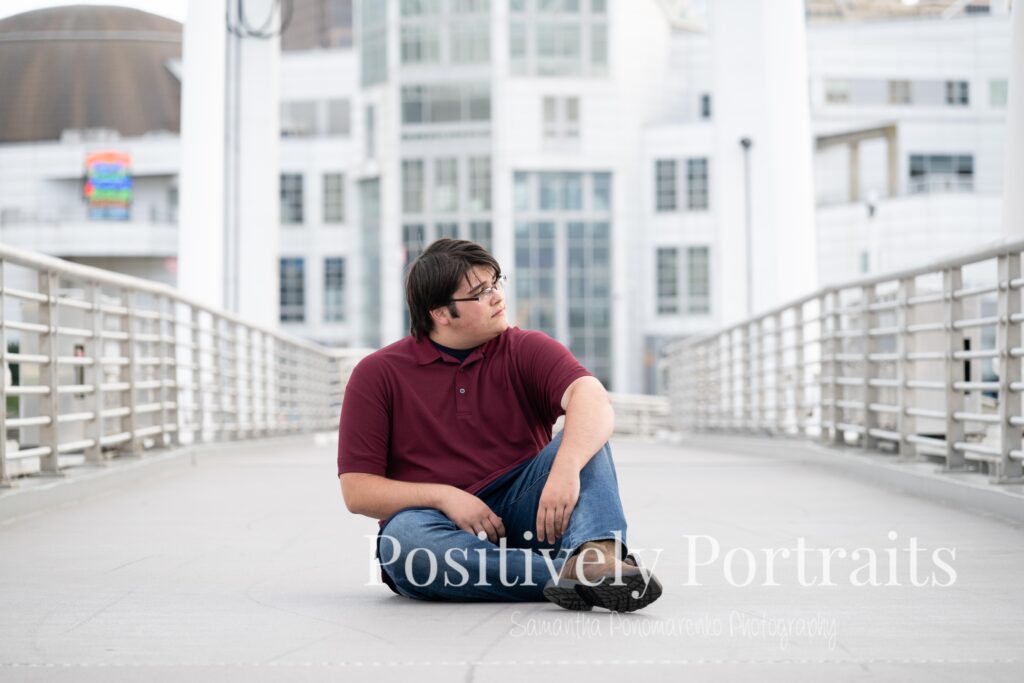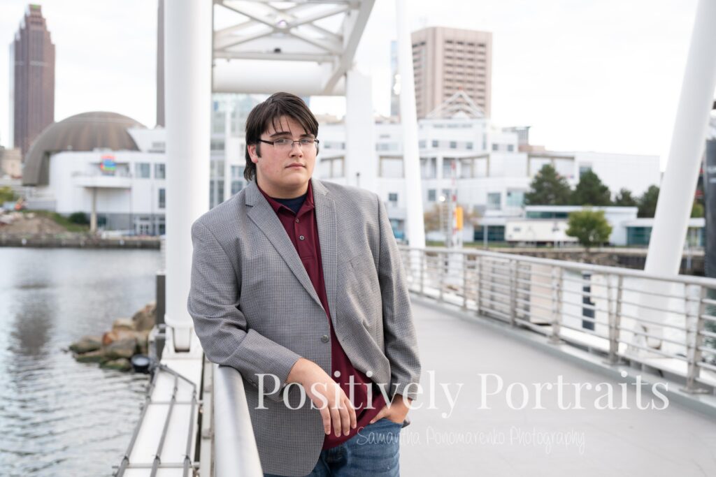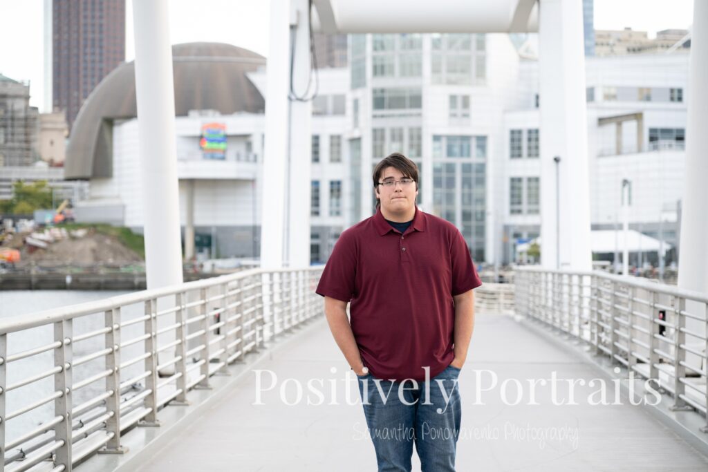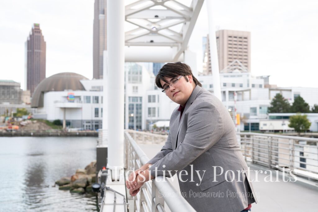 We started Matt’s senior photos in Cleveland by using the reflective buildings and modern city scenery that Voinovich Park has to offer. The glass and architecture around this area make for such clean and bold senior portraits and really give that classic downtown Cleveland look. We also used the bridges and walkways around Voinovich Park, which are perfect for adding depth and variety to senior pictures in Cleveland, Ohio.