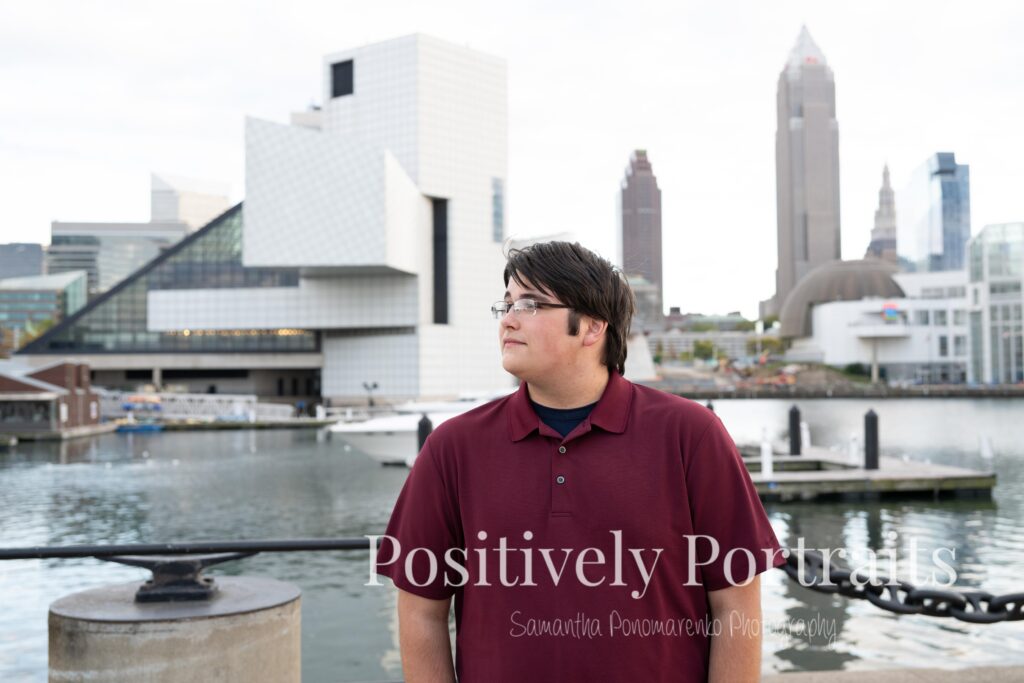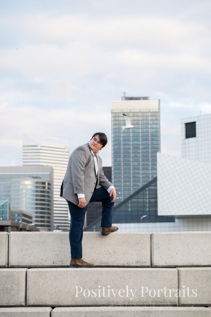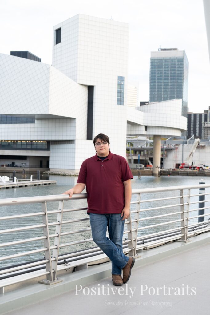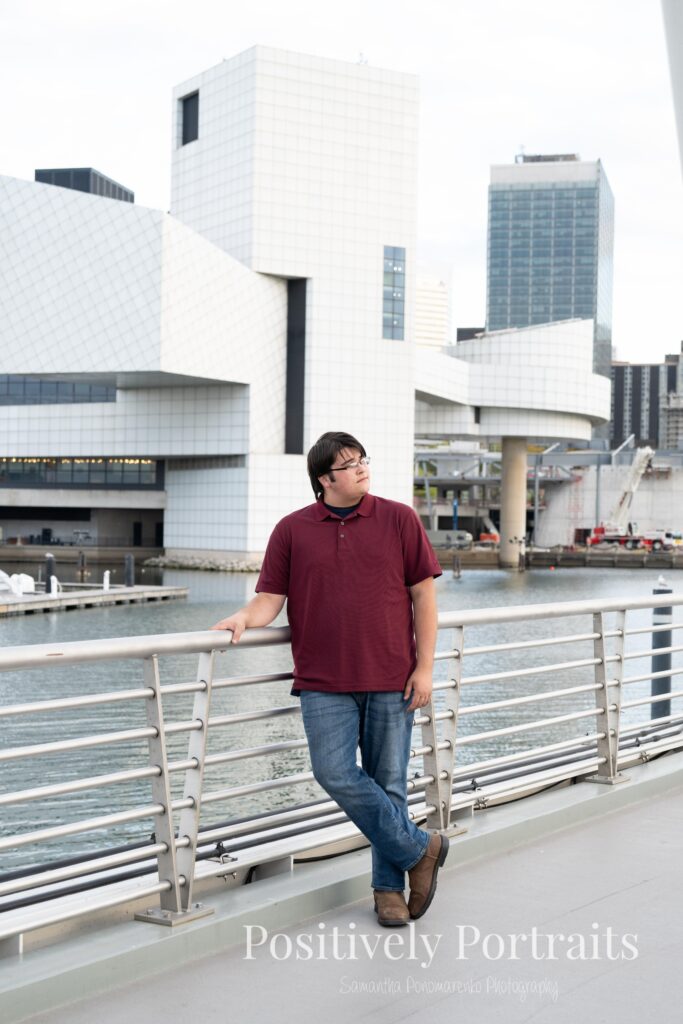 Voinovich Park is such an amazing location for Cleveland senior photos because it offers so much variety in one area. You get incredible views of the Cleveland skyline, the waterfront, and Lake Erie all in one place. During Matt’s senior photo session at Voinovich Park, we were able to walk through different areas and use so many unique backdrops without ever needing to leave the park. One of the coolest parts of doing senior pictures at Voinovich Park in Cleveland is that you can hear planes flying overhead from Burke Lakefront Airport, which adds such a fun and unique city atmosphere to the experience and really reminds you that you are right in the heart of Cleveland.
