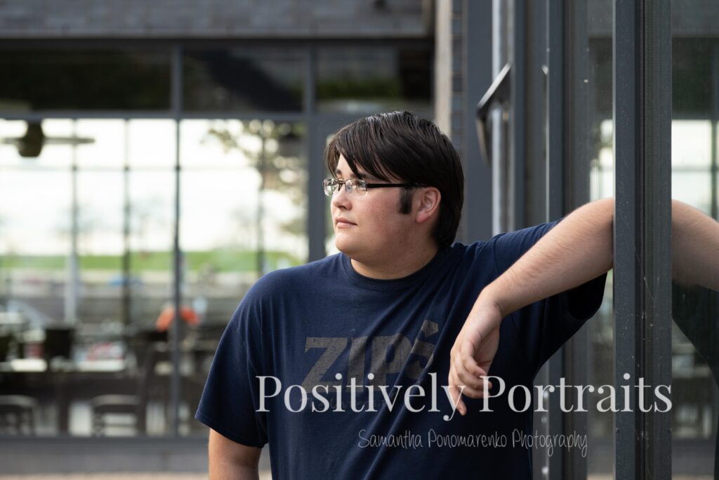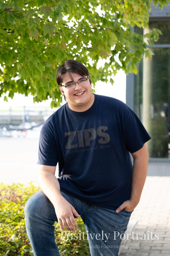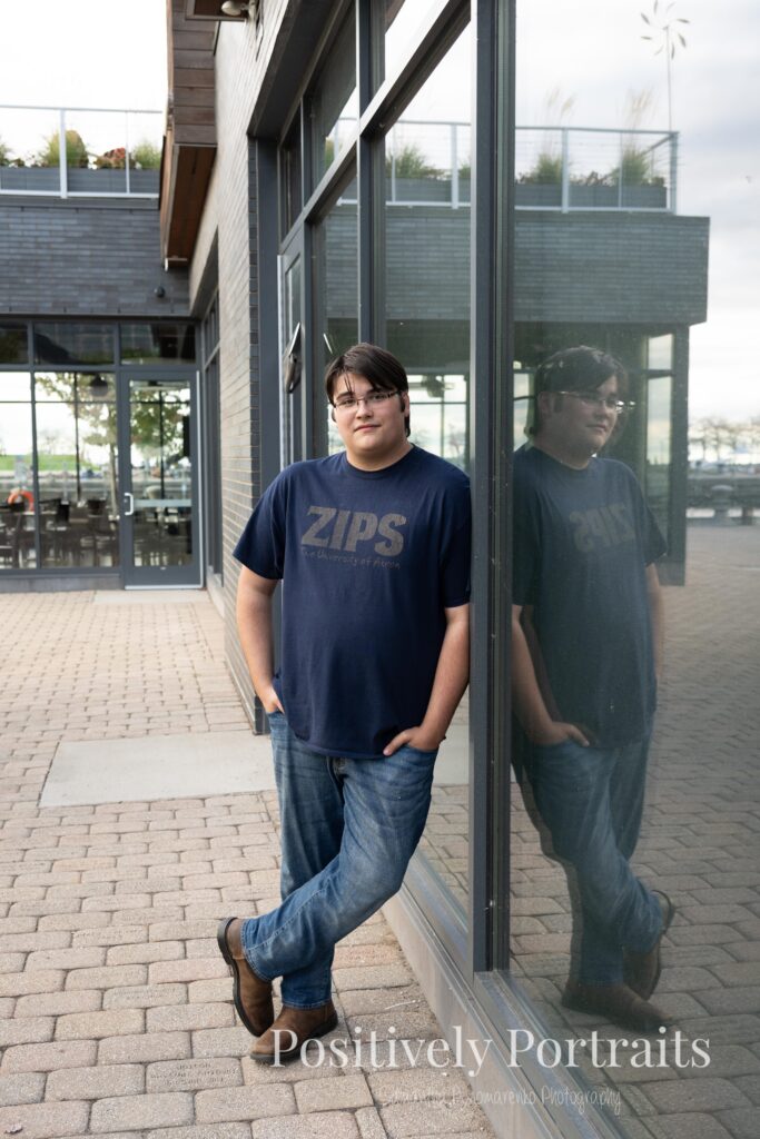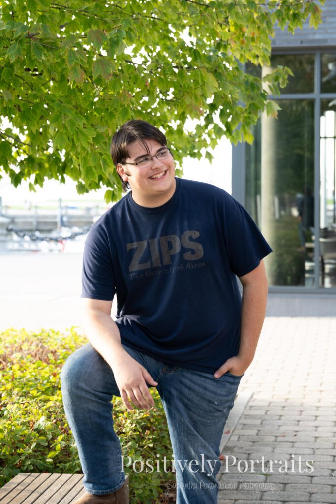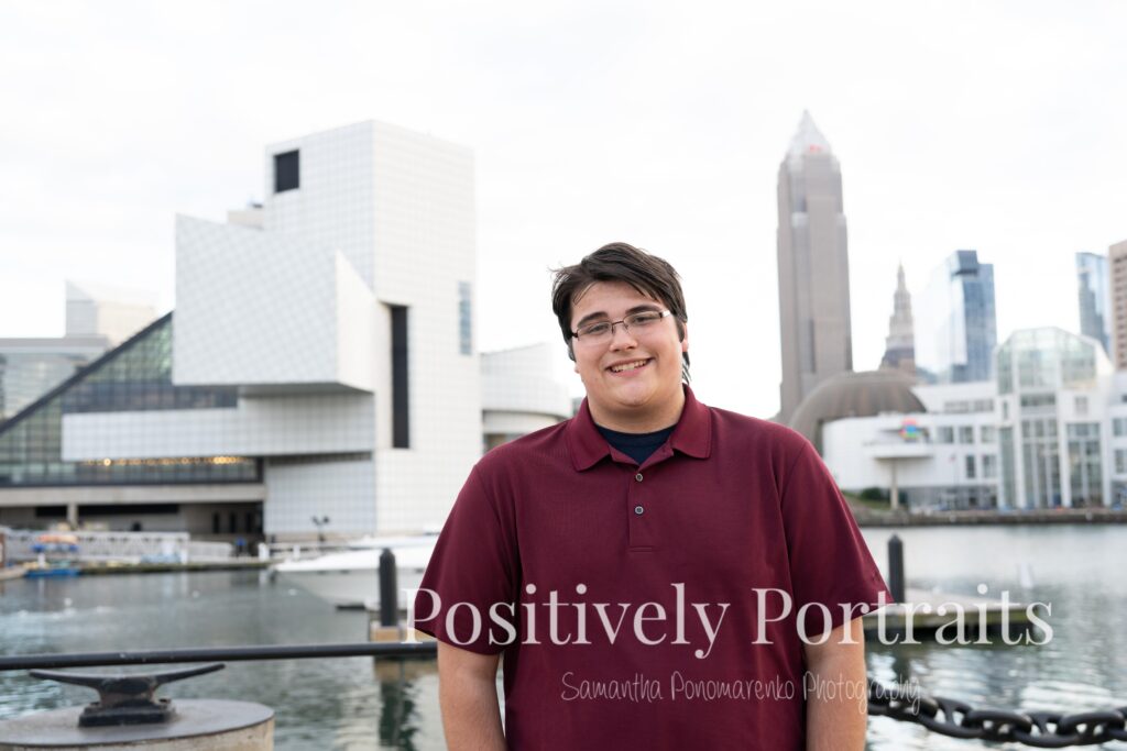 Voinovich Park is such an amazing location for Cleveland senior photos because it offers so much variety in one area. You get incredible views of the Cleveland skyline, the waterfront, and Lake Erie all in one place. During Matt’s senior photo session at Voinovich Park, we were able to walk through different areas and use so many unique backdrops without ever needing to leave the park. One of the coolest parts of doing senior pictures at Voinovich Park in Cleveland is that you can hear planes flying overhead from Burke Lakefront Airport, which adds such a fun and unique city atmosphere to the experience and really reminds you that you are right in the heart of Cleveland.