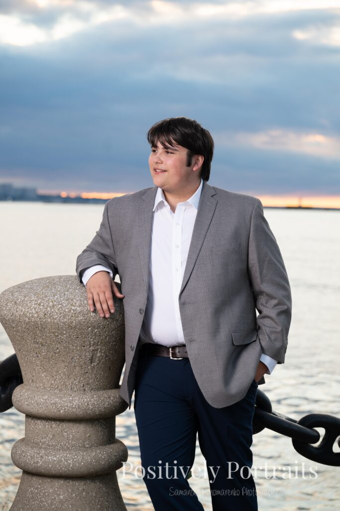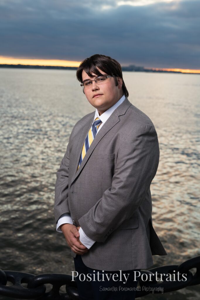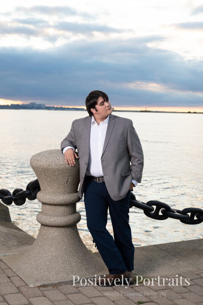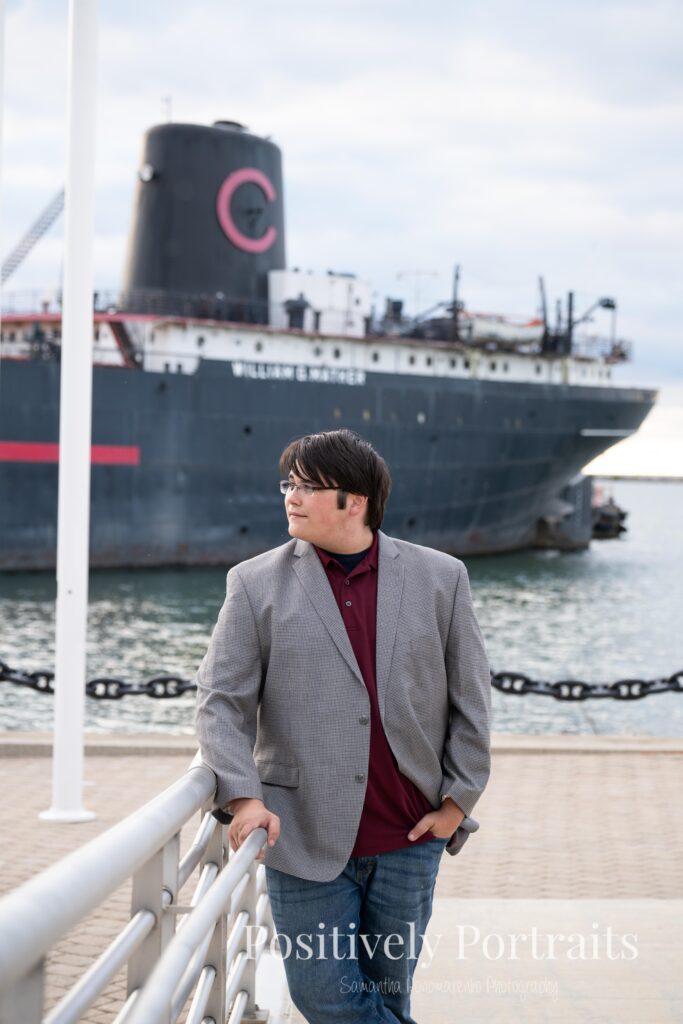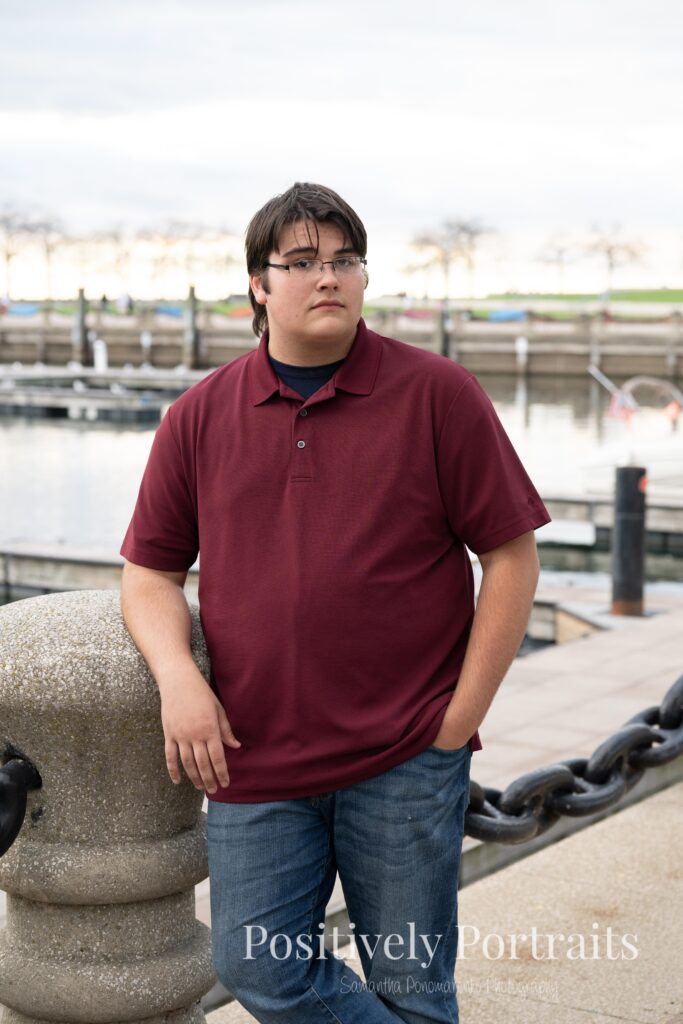 Of course, one of the biggest reasons Voinovich Park is such a popular spot for senior photos is Lake Erie. We made our way closer to the water and used Lake Erie as a backdrop for some of Matt’s senior portraits, and the views never disappoint. The mix of the lake, the skyline, and the open space makes Voinovich Park one of the best locations for senior photos in Cleveland for anyone who wants both nature and city in their session.