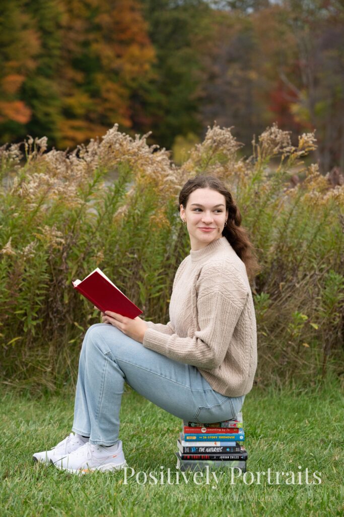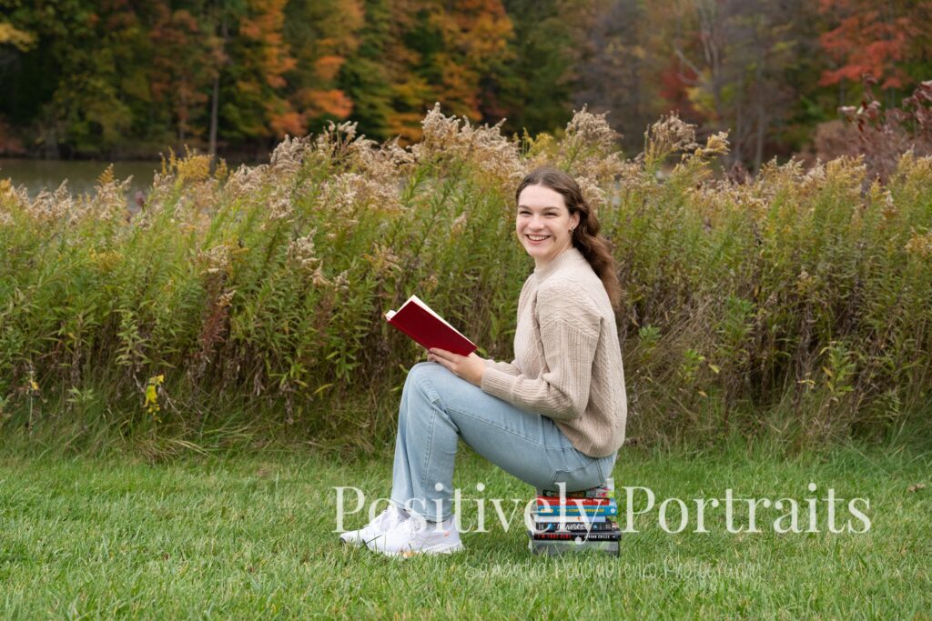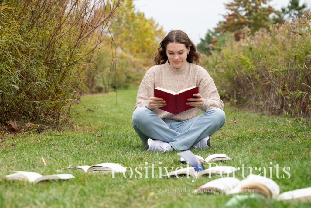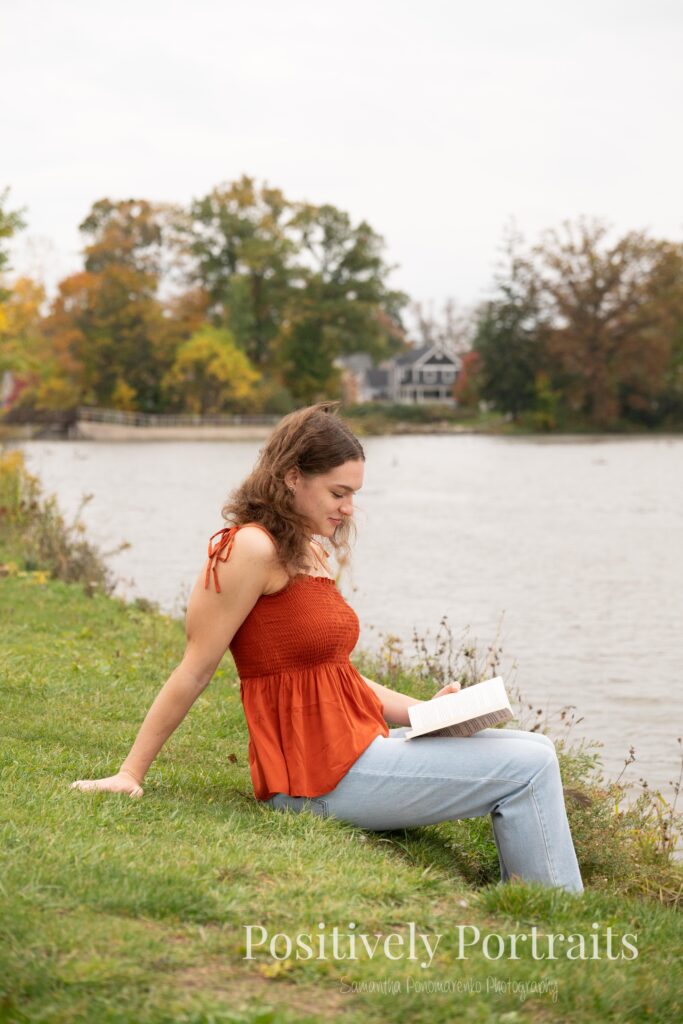 Alexandra brought along some of her favorite things to use as props, including her books. Just as we laid them out and started photographing, the weather decided to add a little drama and it began to drizzle. Honestly, it felt very fitting for a cozy fall session, but we took a short pause and waited it out. One of the things I love most about Brunswick Lake Park is the variety of scenes and how easy it is to drive around the lake from spot to spot. It makes sessions there feel like multiple locations in one, without ever having to go far.